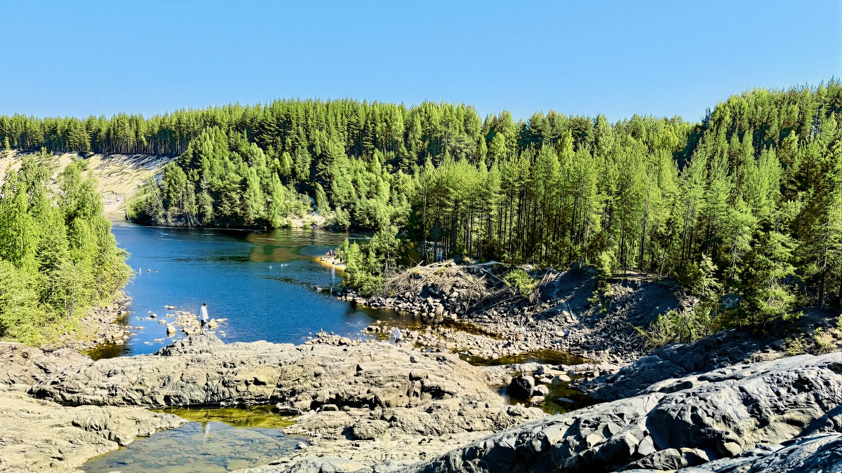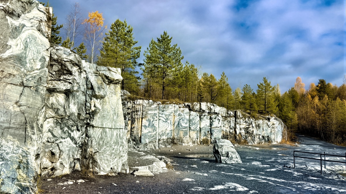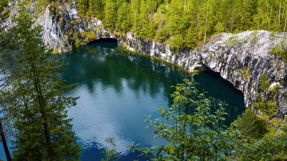 Чаша мраморного каньона – настоящее рукотворное чудо: серо-белый мрамор в обрамлении высоких елей и берез необыкновенно гармонирует с изумрудного цвета водой на дне.